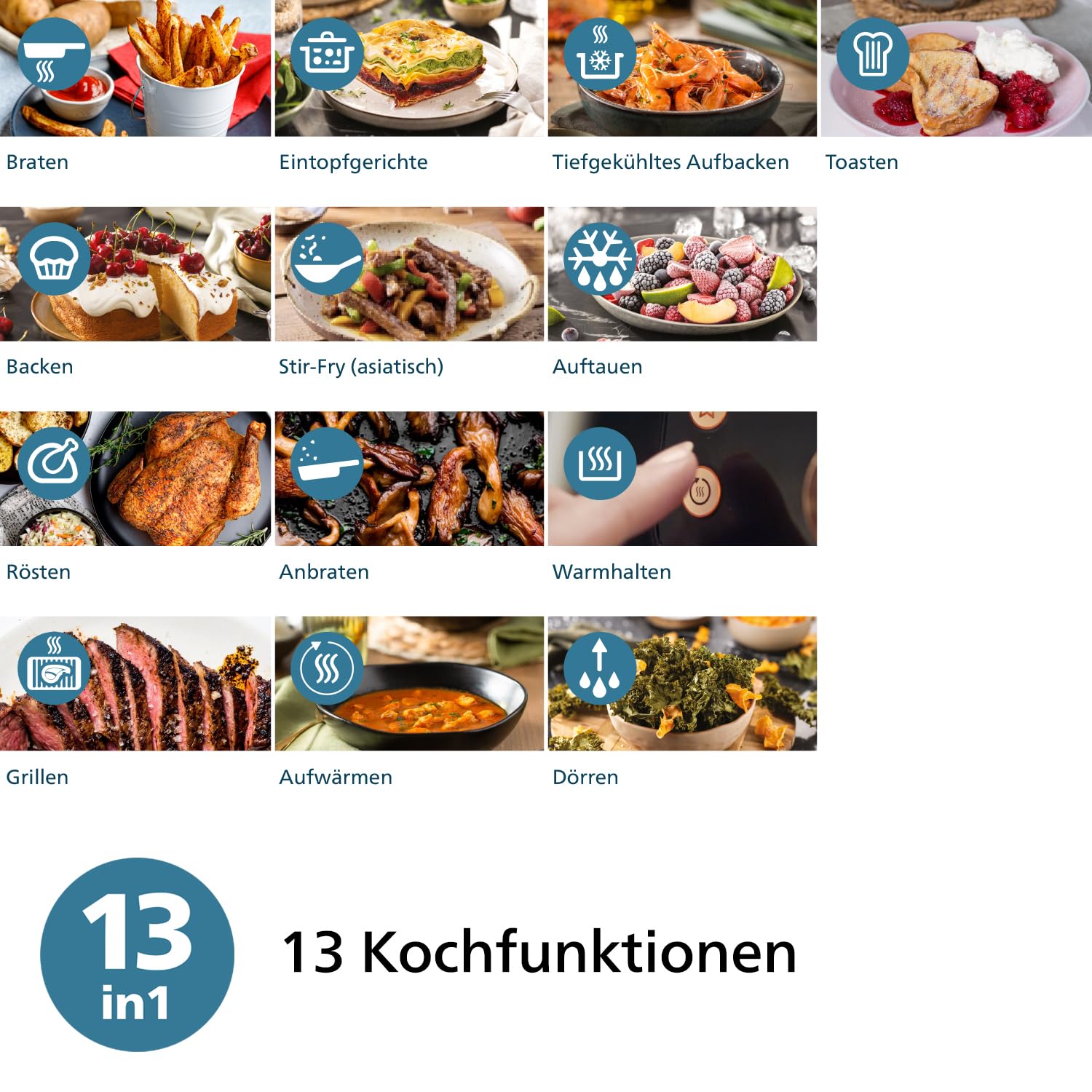 - 13-in-1-Kochen: Frittieren, Backen, Grillen, Braten und mehr. Manuelle Einstellung von Zeit und Temperatur oder Verwendung von Voreinstellungen für müheloses Aufwärmen, Auftauen und Warmhalten